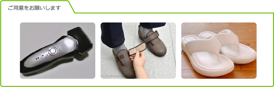 なお、レンタル品には電気シェーバー、介護シューズ、上履きは用意されておりませんので、各自ご用意下さい。