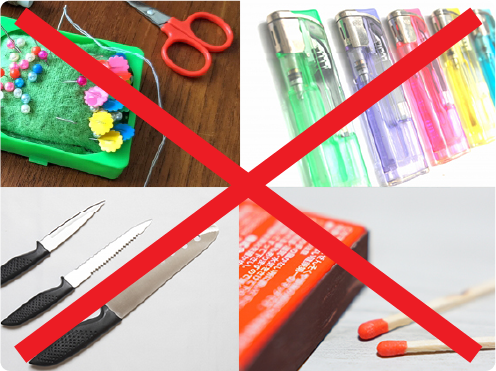 ・マッチ、ライター、刃物類(ナイフ、はさみ、包丁、針)は危険防止のため携帯できません。